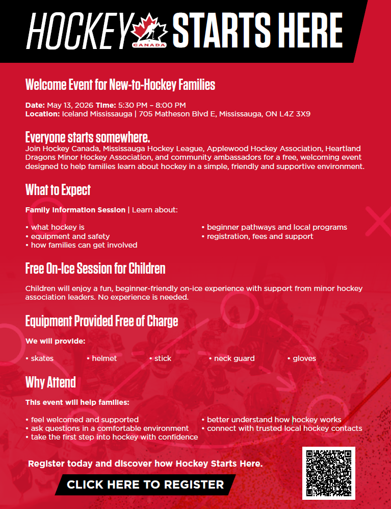 Join Hockey Canada, Mississauga Hockey League, Heartland Dragons Minor Hockey Association, and community ambassadors for a free, welcoming event designed to help families learn about hockey in a simple, friendly and supportive environment.